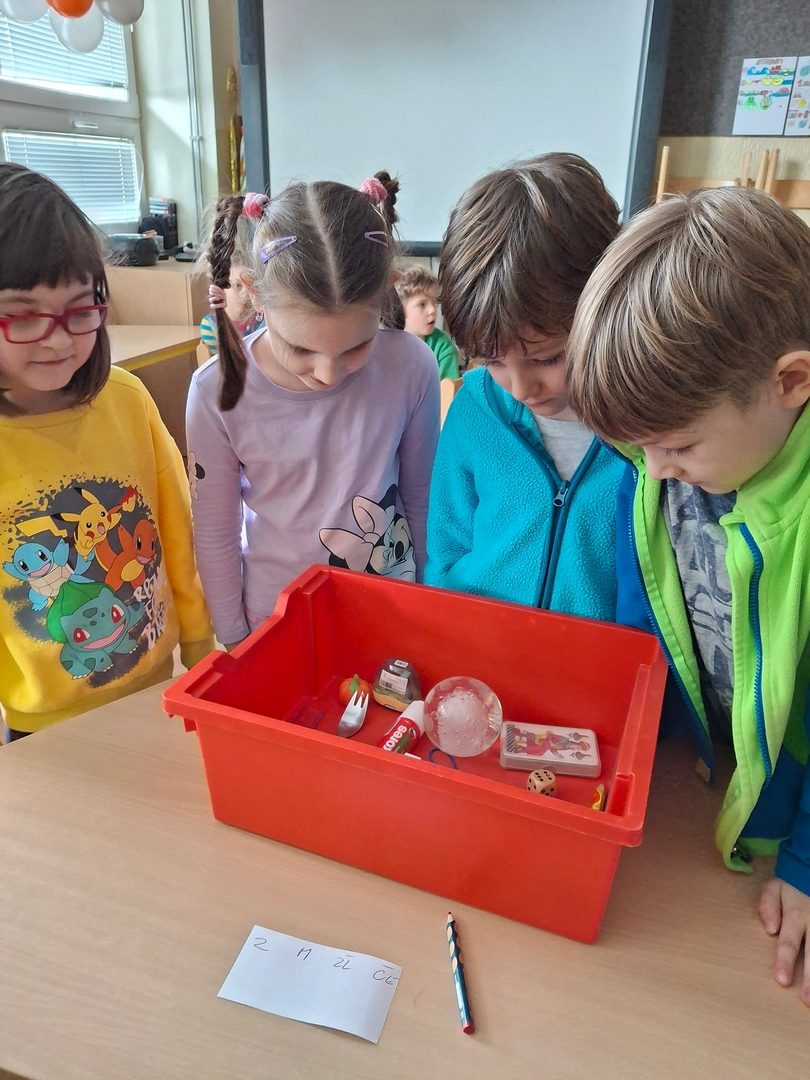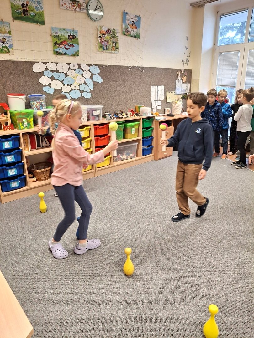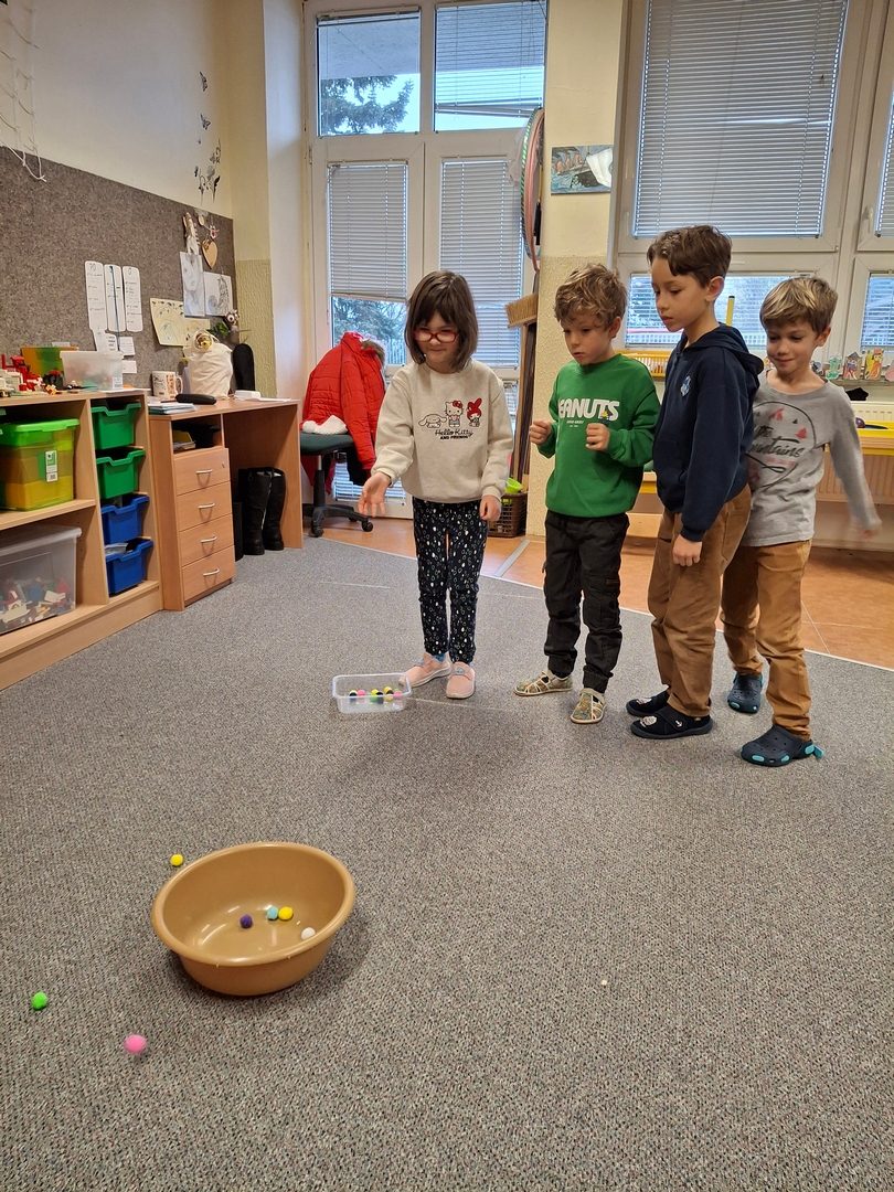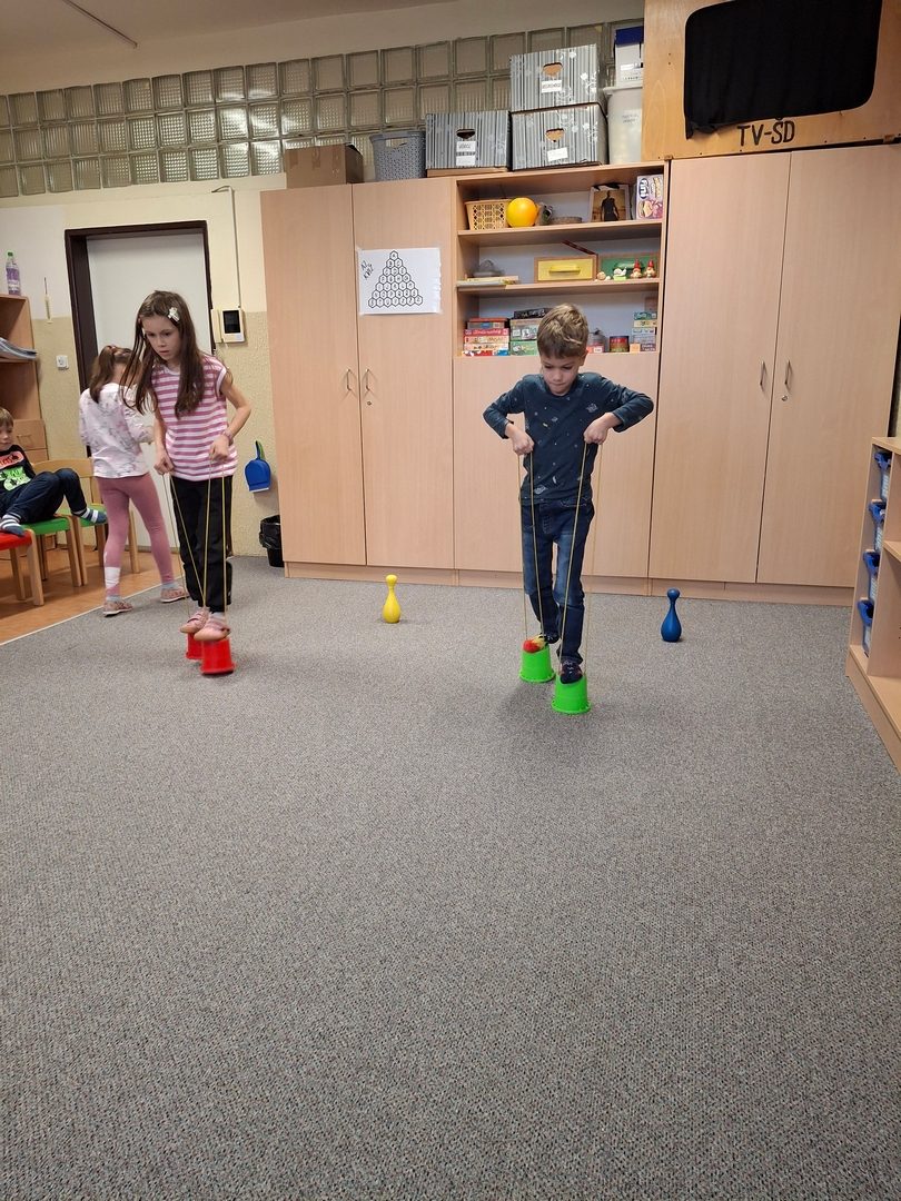 - hry ve třídě: Na mrkanou, Křídla,kořeny,končetiny,Lovení bonbónů, hod kuličky do kloboučku, pyramida z kelímků