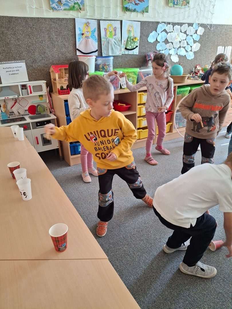 - soutěže ve třídě ( přenášení kelímků balonky, kohoutí zápasy)