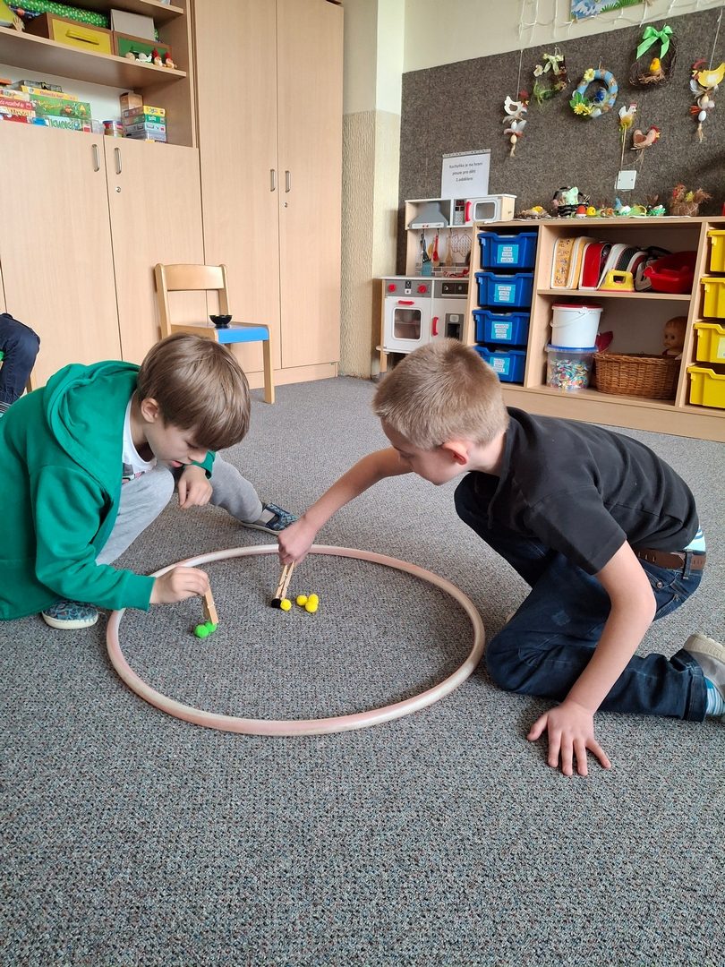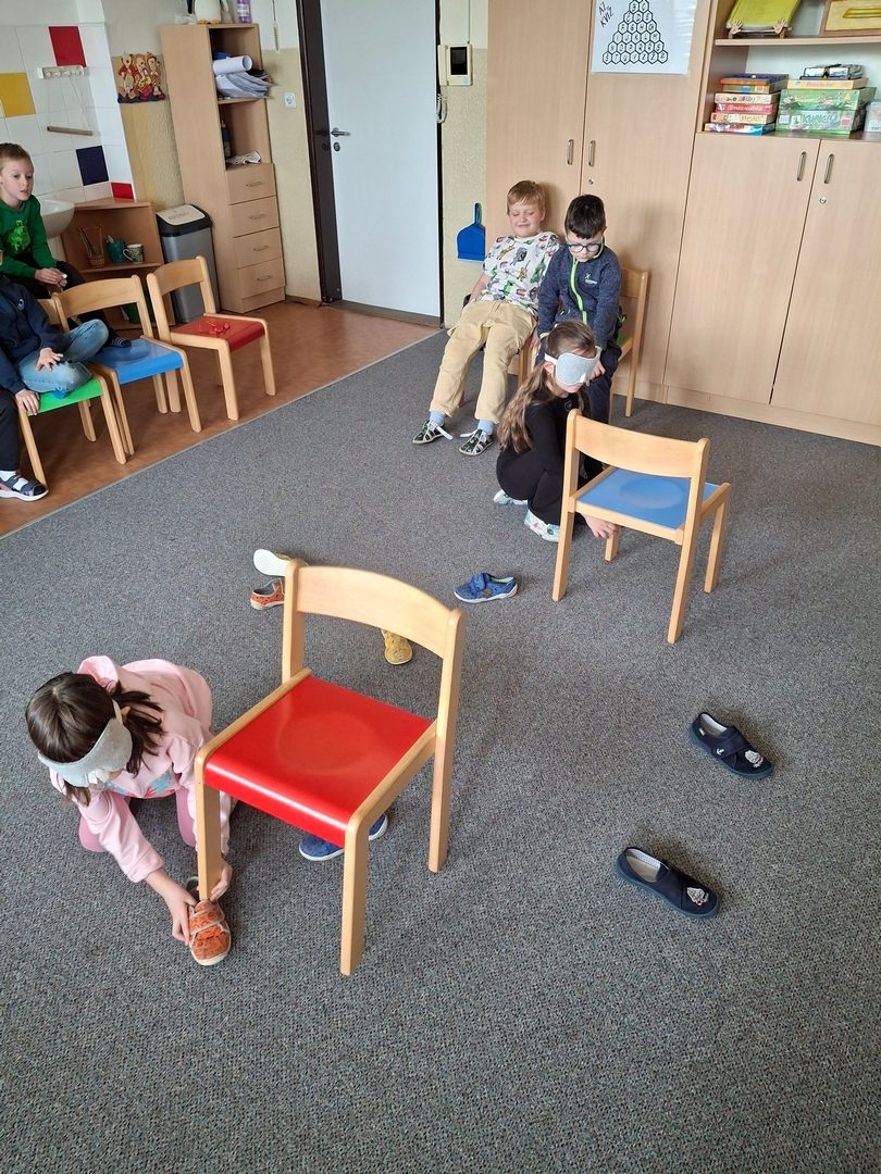- hry dvojic ve třídě- Obouvání židlí, přenášení kuliček kolíčkem,