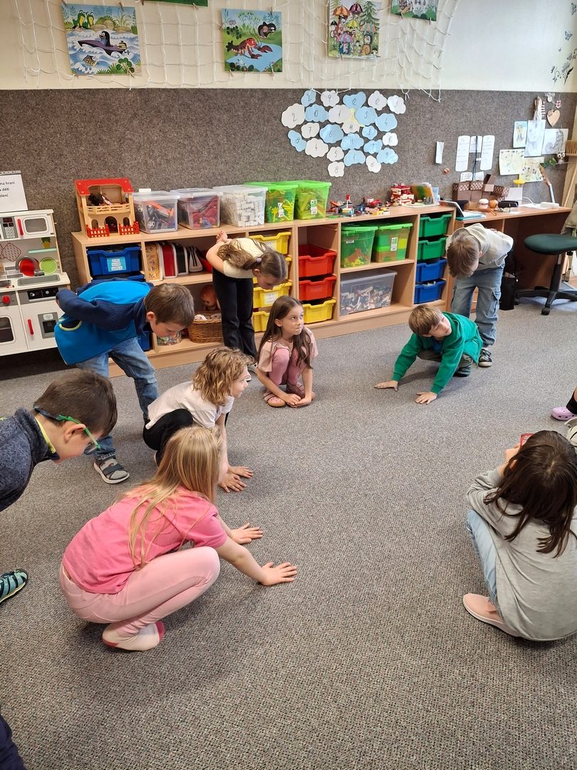 - sportovní odpoledne v tělocvičně: cvičení s míčem, soutěž dvojic v předávání míčků koulením, hra s tyčemi, Sanitka, Jak chodí zvířátka