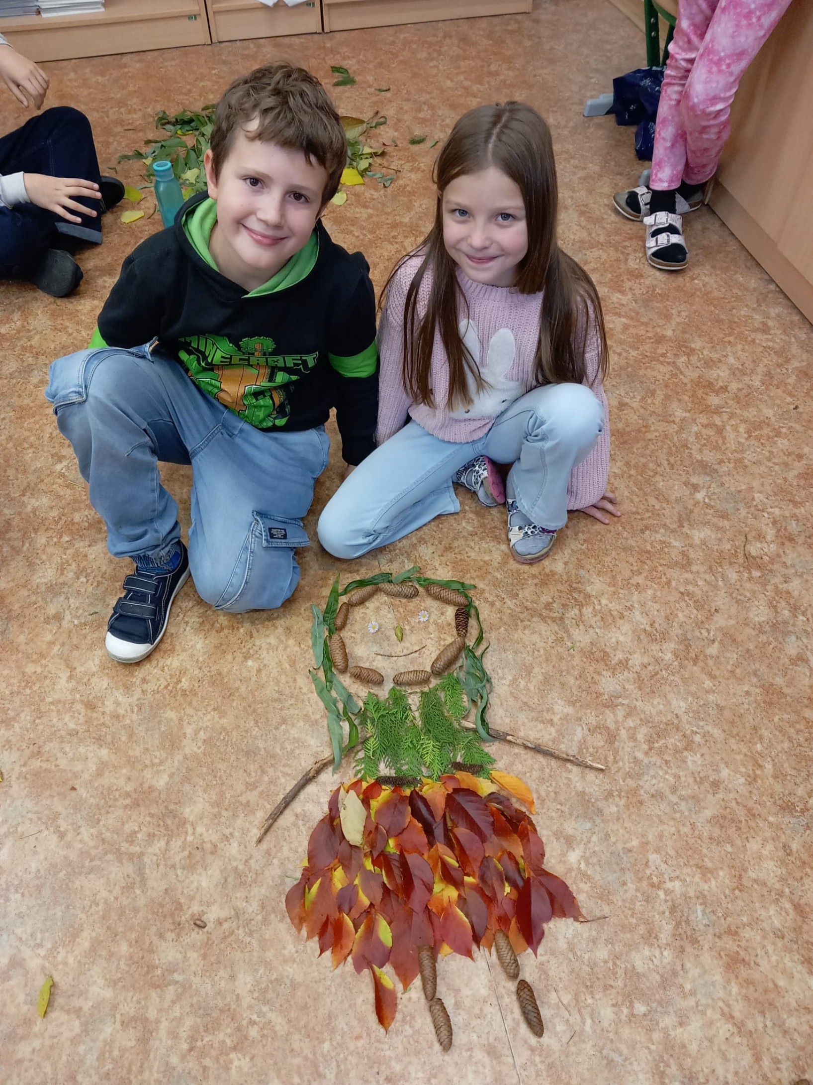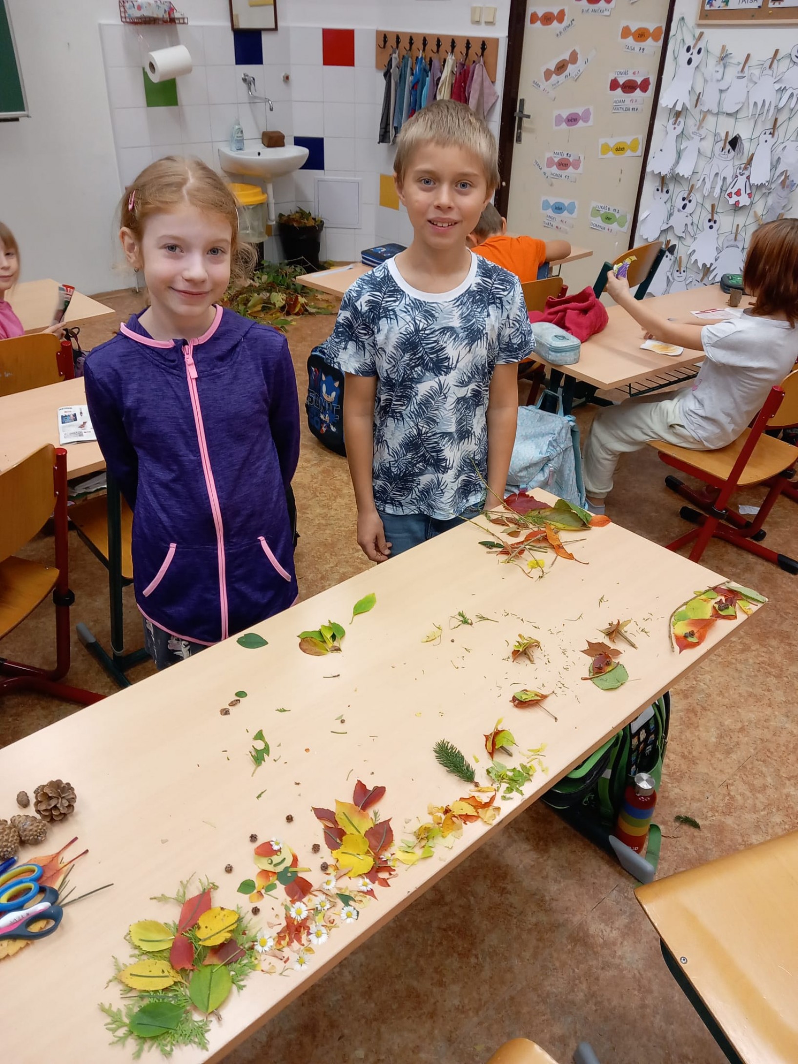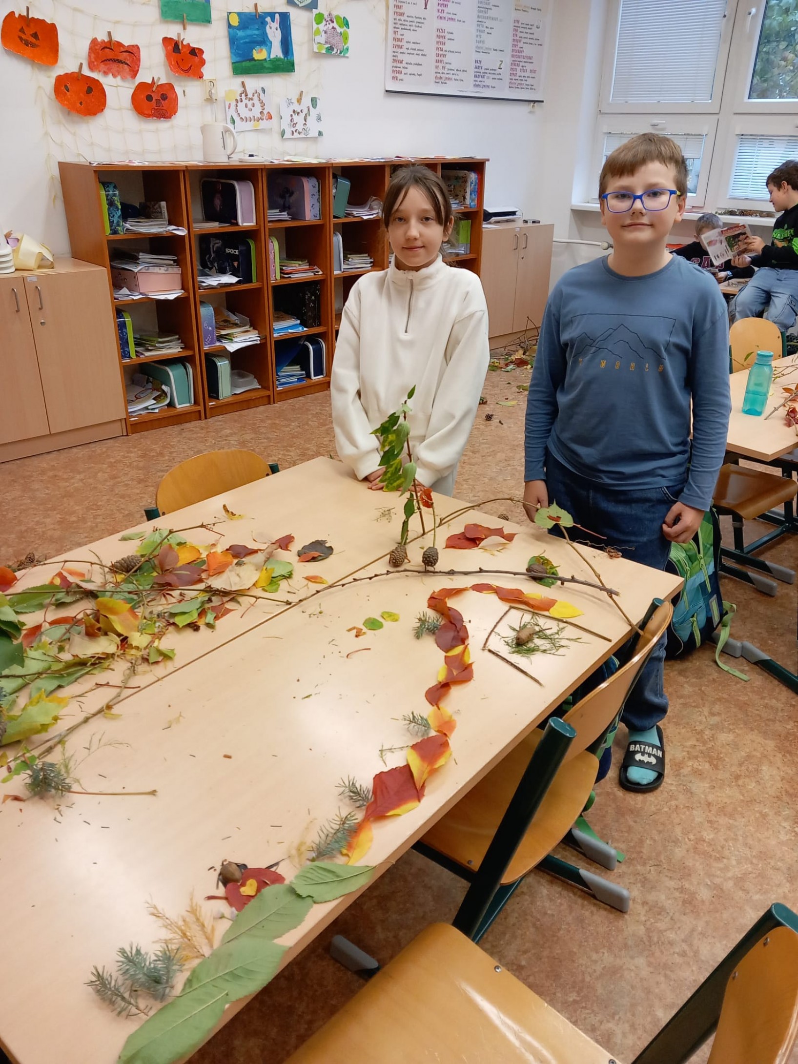 Co je lepší v tomto počasí, než přinést si do třídy kus přírody a hlavně barev? Děti ve dvojicích pracovaly s přírodním materiálem, který přinesly – listy, větvičky, šišky, skořápky ořechů, kamínky a další drobnosti. Společně vyráběly postavičky, ornamenty atd. Fantazie neměla hranic – každý tým si přinesl vlastní kreativní přístup a originální zpracování materiálu. Práce s listy, větvičkami a vším, co nám příroda poskytla, nás všechny moc bavila a byla skvělou příležitostí, jak si hravě vyzkoušet tvořivost a spolupráci.
