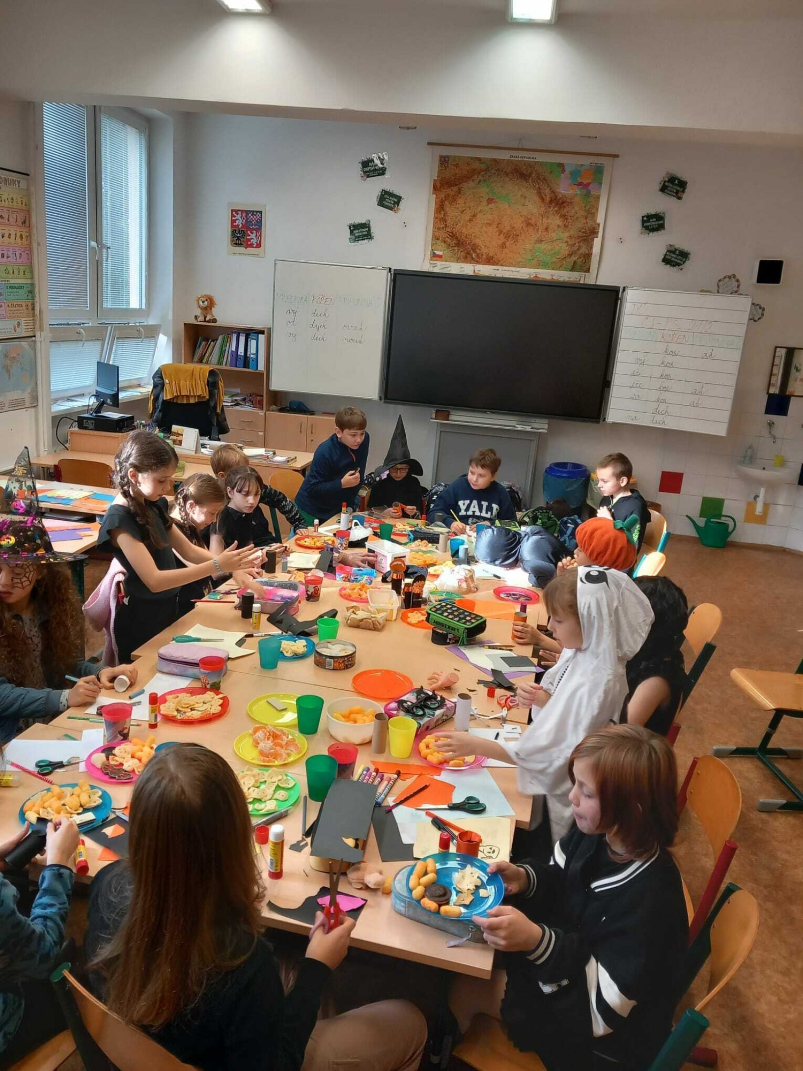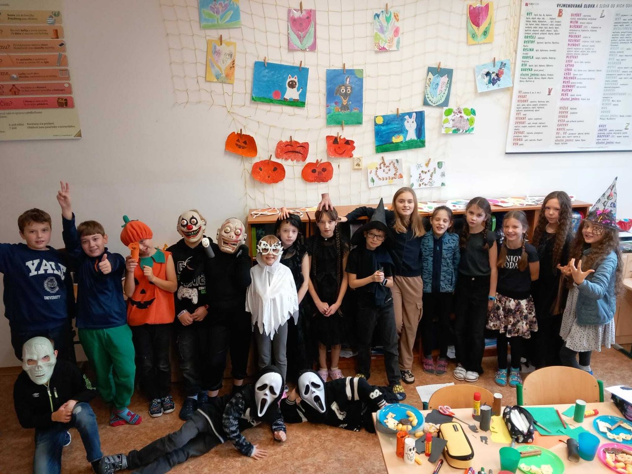 Poslední listopadový pátek se naše třída proměnila v halloweenskou dílnu plnou masek, smíchu a barev. Přišli jsme v kostýmech a pustili se do tvoření – z obyčejných ruliček od toaletního papíru vznikaly nejrůznější strašidelné bytosti a halloweenské dekorace. Celou aktivitu vymyslel a vedl náš spolužák Fíla, který měl skvělý nápad a všechno zorganizoval. Poté jsme si své masky i výtvory navzájem představili a pokračovali zábavným „běhacím čtením“ ve dvojicích. Dozvěděli jsme se zajímavosti o Halloweenu a Dušičkách – co mají společného a čím se liší. Nakonec si každý vyzkoušel samostatné počítání příkladů rozmístěných po třídě. Správným řešením byla sladká odměna. Lavice jsme měli po celý den uprostřed třídy, takže vznikl prostor pro tvoření, běhání i malé pohoštění, které jsme si společně užívali. Bylo to veselé, hravé a plné podzimní atmosféry!