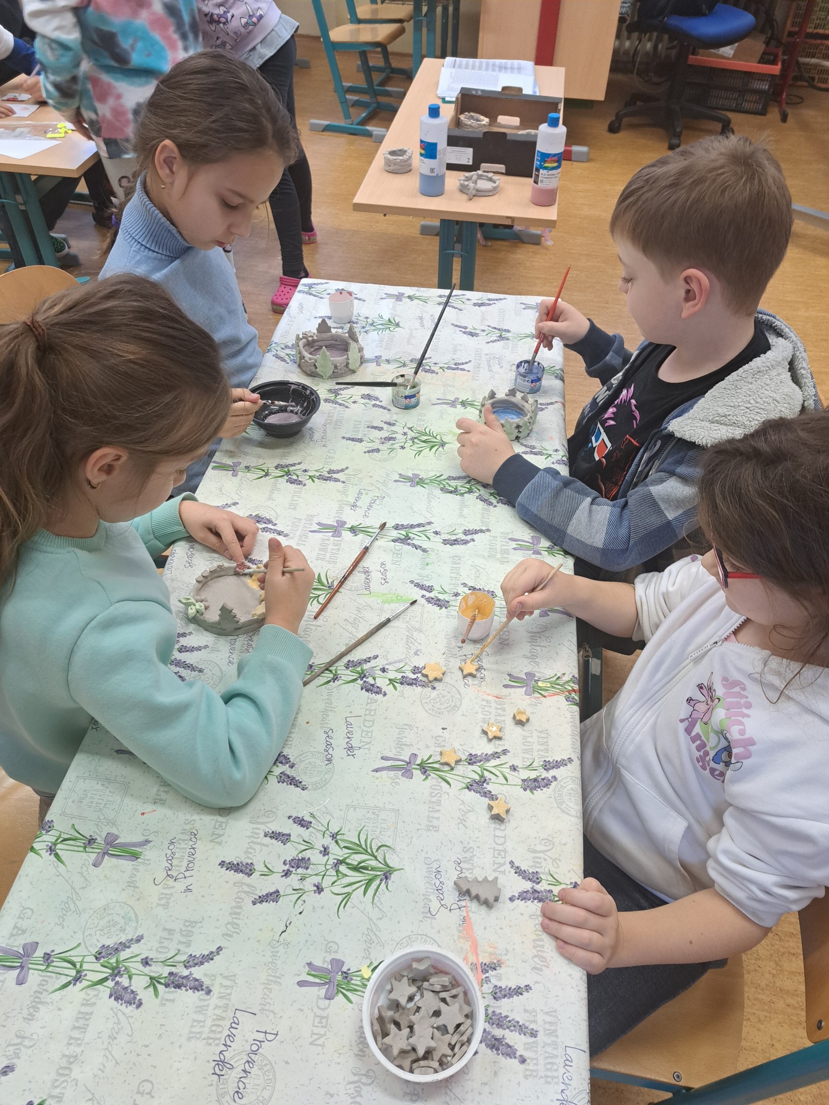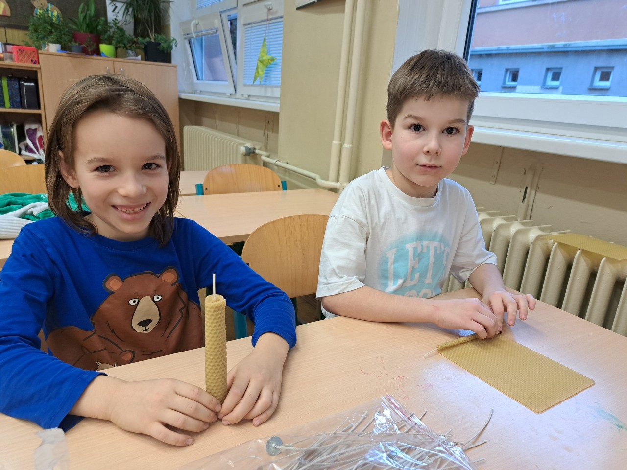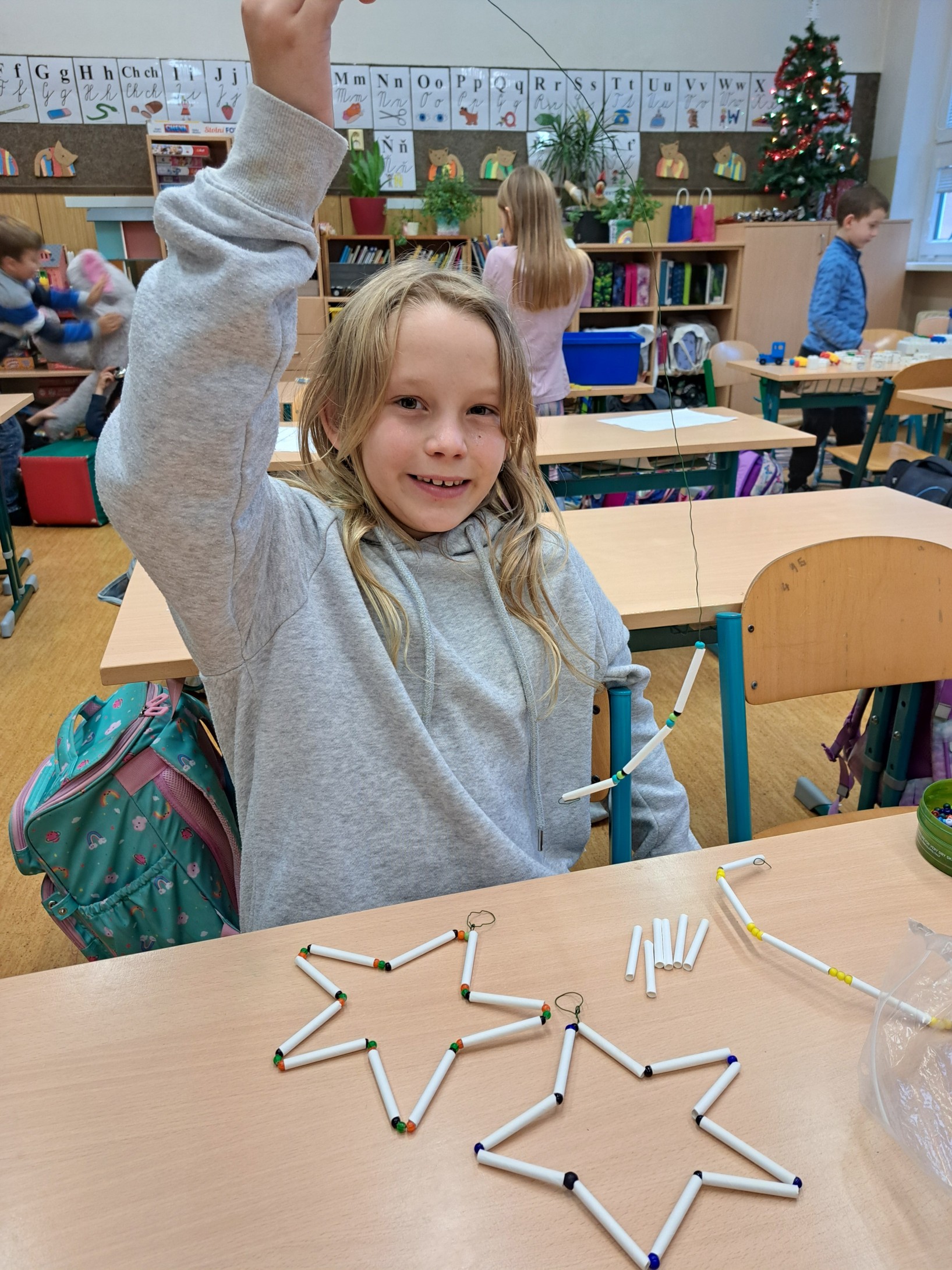 V prosinci vrcholí přípravy na vánoční koncert, besídku, vánoční trhy. Vyrábíme krásná přání, keramiku, motáme svíčky z plátů včelího vosku. Vyrábíme hvězdy z papíru i drátků. Posloucháme koledy, sledujeme videa o narození Ježíška, vyprávíme si o tajných přáních a nadílce pod stromeček. Navštívili jsme Adventní úkolovou stezku a dozvěděli se něco nového o starých vánočních zvycích. Zasportovali jsme si v tělocvičně. Čteme knihu na pokračování Brunclík a lev.