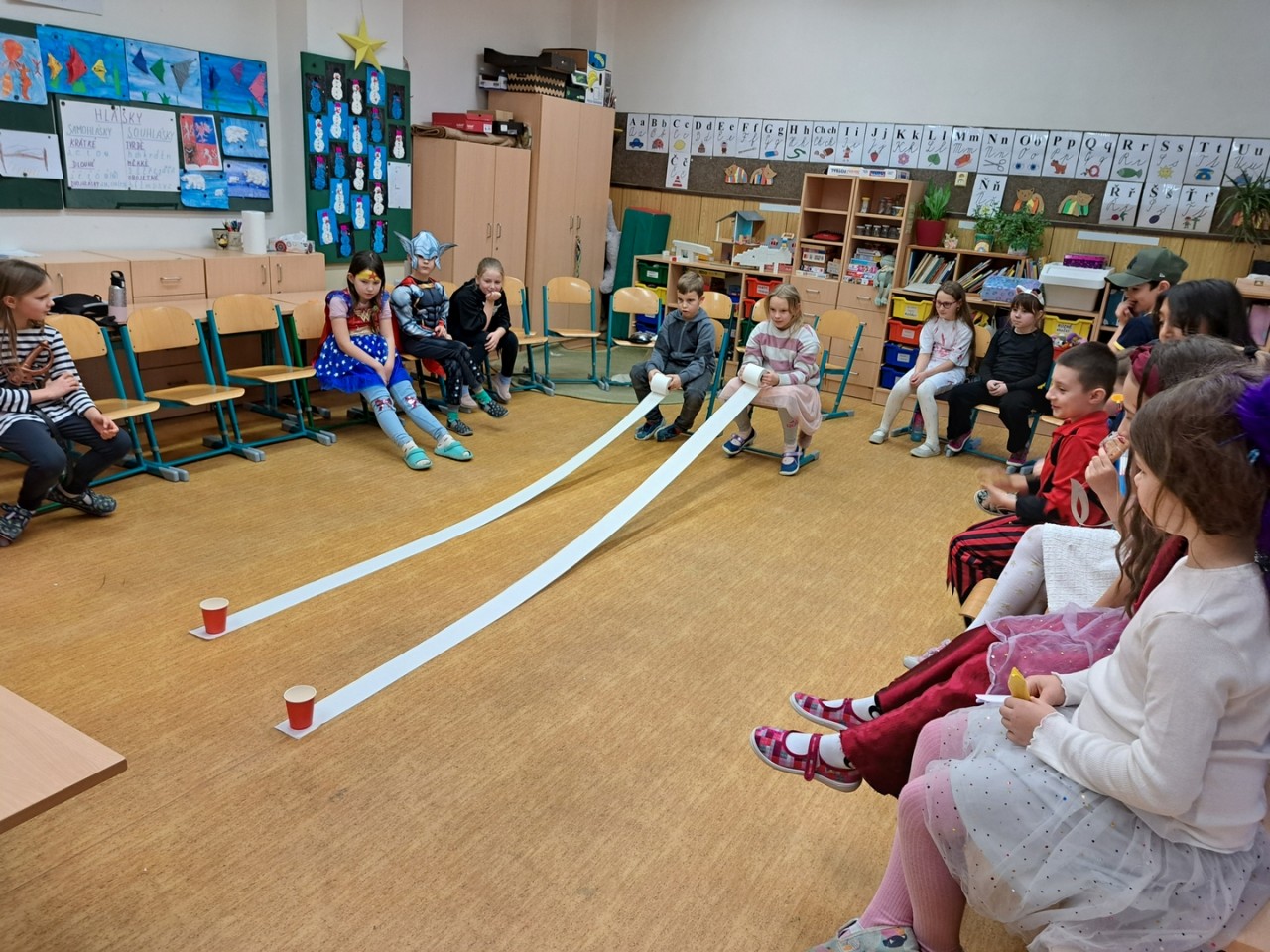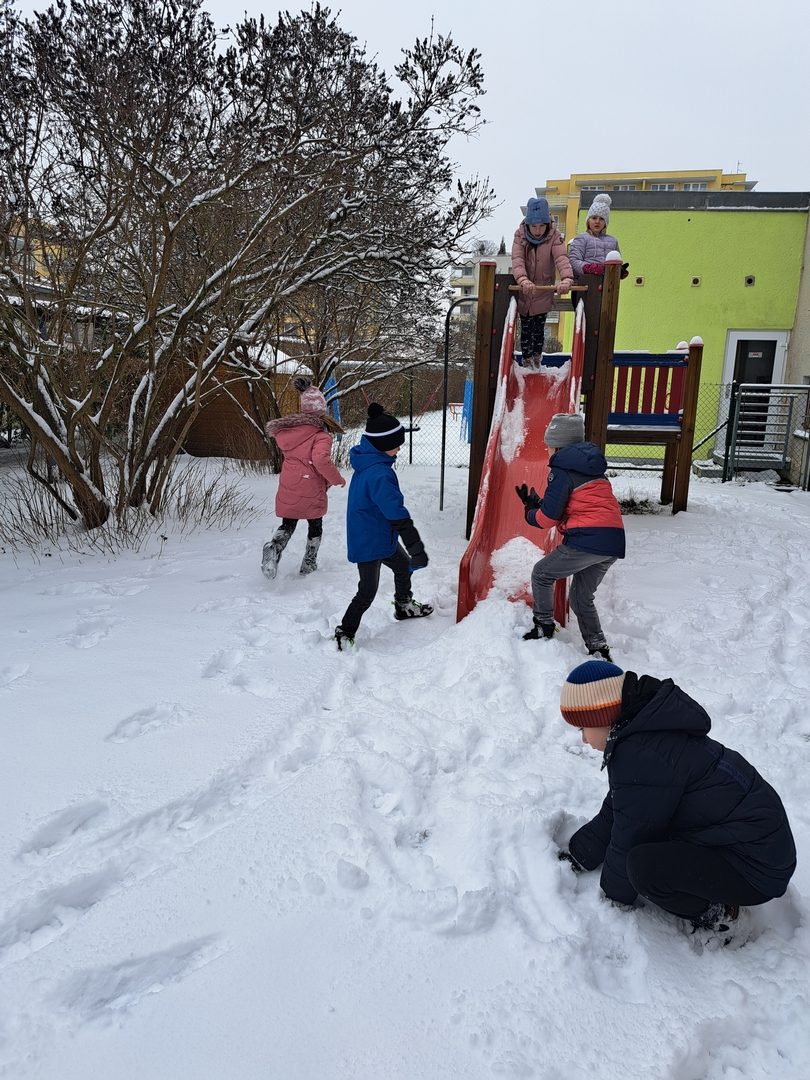 V únoru se radujeme ze sněhové nadílky a hojně pobýváme venku na školní zahradě. Únor je ve znamení masopustu – připravujeme si masky, povídáme si o českých tradicích, pouštíme si videa o masopustu, např. animaci Chaloupka na vršku od výtvarnice a režisérky Šárky Váchové, jejíž výstavu jsme v České televizi v galerii Rohlík navštívili. Děti si zde mohly vyzkoušet i vlastní animaci, což je velmi zaujalo. Masopustní karneval, tanec a soutěže jsme si opravdu užili.
