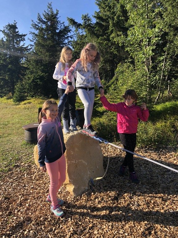 Ve čtvrtek jsme se po snídani vydali lanovkou do Janských Lázní a odtud jsme šli pěšky lesní cestou asi 1 km na Stezku korunami stromů (stezka se vine v celé délce 2 180 m a vyhlídková věž je vysoká 45,5 m). Když jsme sestoupili zpátky na pevnou zem, měli jsme co dělat, abychom stačili lanovku zpět a vrátili se včas na oběd. Po obědě měly děti polední klid. Před svačinou pak vzorně zapisovaly předposlední den do svého školního deníku. Naší poslední společnou akcí na škole v přírodě byla cesta za pokladem. Paní vychovatelka pro děti připravila cestu vyzdobenou barevnými stužkami a děti musely odpovídat na otázky. Na konci cesty na ně čekal poklad, který ukrýval sladkosti. Po večeři jsme sbalili kufry a paní vychovatelka vyhodnotila bodování v úklidu a soutěž skupin. Děti dostaly odměny a spokojené ulehly do svých postýlek. Škola v přírodě končí a všechny děti se těší na maminky a tatínky!