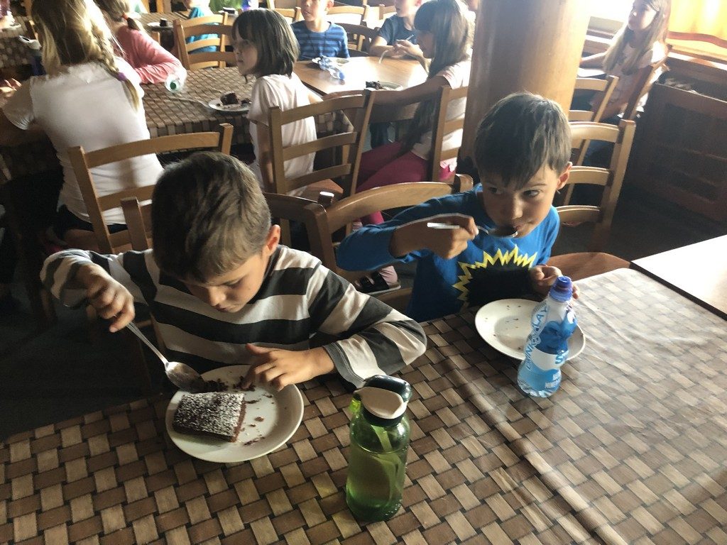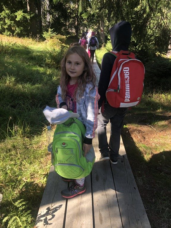 V pondělí jsme měli celodenní výlet. Hned po snídani jsme se pěšky vydali do Horního Maršova. Naobvědvali jsme se na odpočívadle v lese, pan kuchař nám s sebou upekl obrovské kuřecí řízky! Z Horního Maršova jsme odjeli autobusem do Pece pod Sněžkou, kde na nás čekal elektrovláček, který nás zavezl na Kolínskou boudu. Na Kolínské boudě děti krmily kozy, hrály si na různých průlezkách, houpaly se, skákaly na trampolínách, chodily bosy po různých typech povrchu, běhaly sem a tam, z jedné atrakce na druhou :-) Odtud jsme se vraceli zpět pěšky lesem podél plavební přehrady Klausa. Děti pokračovaly s paní vychovatelkou sběrem bylinek pro princeznu, zítra si budou vyrábět ve skupinkách ve ŠD herbář. Později děti hledaly a sbíraly papírové motýly, a tak získaly i sladkou odměnu.Děti byly celý den moc šikovné!!!