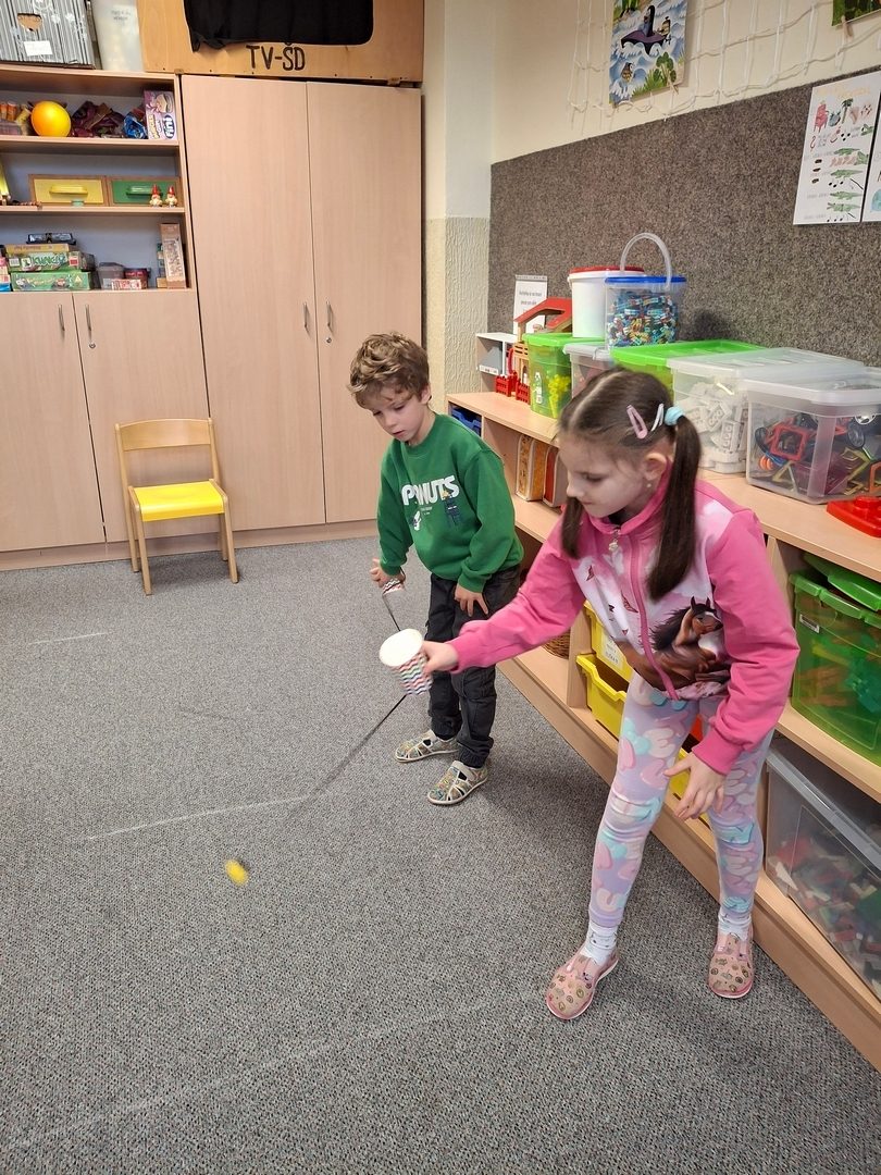 - hry ve třídě (foukání do kelímku, přetahovaná a lovení bonbonů, cvrnkání kuliček, přenášení kloboučků)