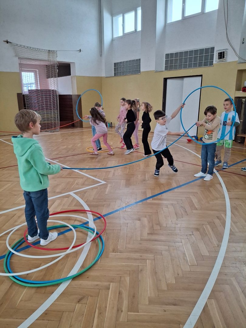 - soutěže v tělocvičně s obručemi a Sanitka (míčová hra)