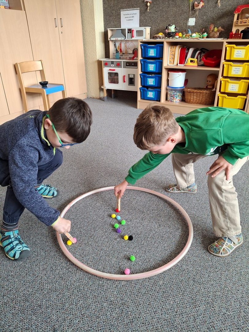 - hry dvojic ve třídě- Obouvání židlí, přenášení kuliček kolíčkem,
