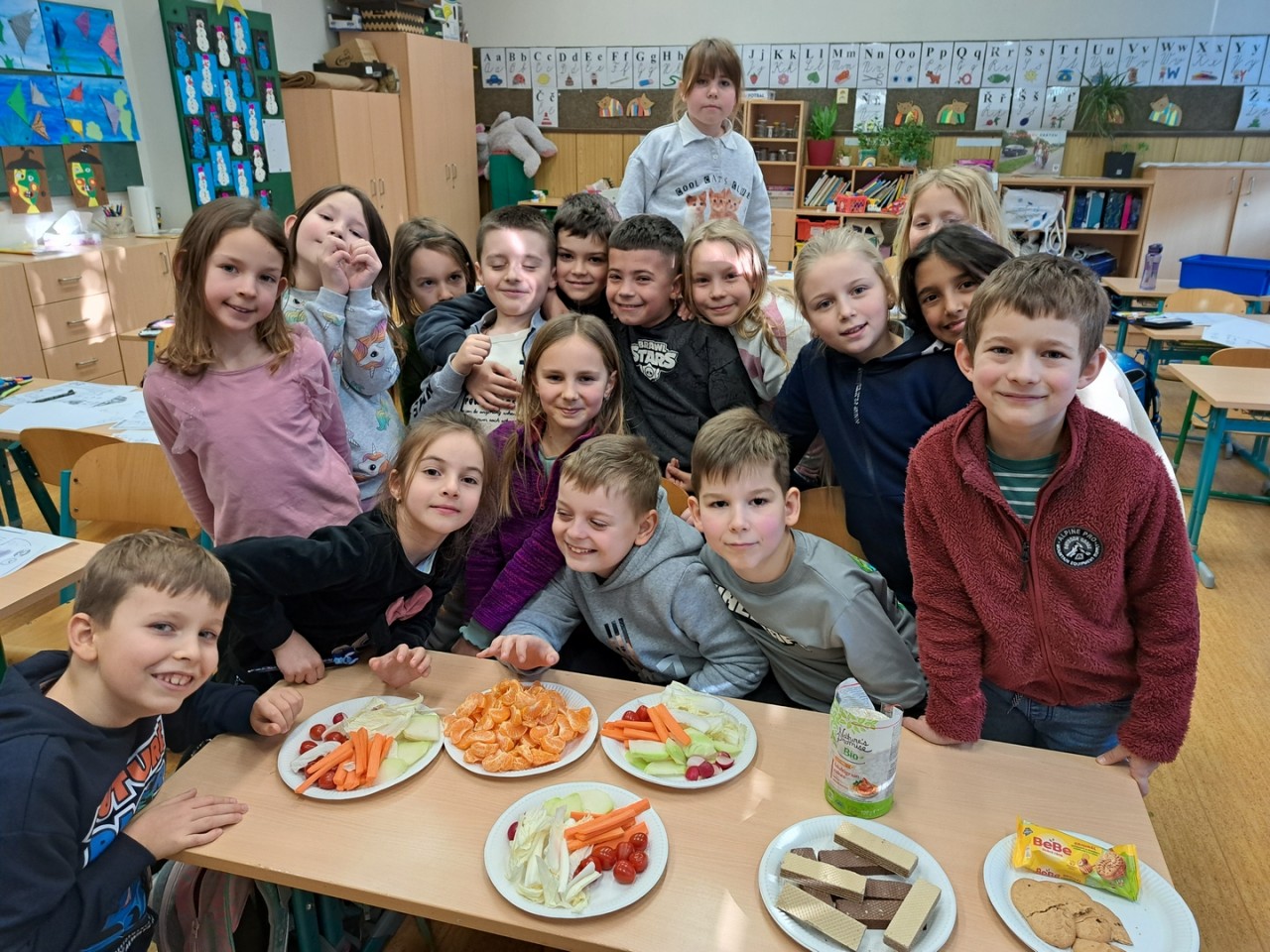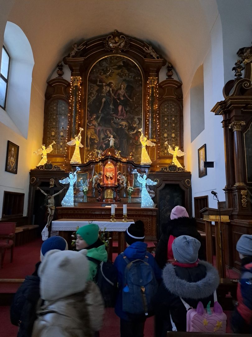 Začátkem ledna k nám přicházejí tři králové. Vyrábíme záložky do knihy s jejich jmény. Vyprávíme si o významu křesťanských symbolů, se kterými jsme se seznámili při hledání loretánského pokladu v Loretě, jsou to: víra, naděje, láska. V Loretě jsme plnili úkoly a dozvěděli jsme se mnoho zajímavých věcí: např. co je to reliéf, monstrance, poutní místo, oltář a také, že zvonkohra na věži má 27 zvonů. Navštívili jsme betlém u bratří kapucínů. Jeden týden jsme se věnovali zdravým a nezdravým potravinám, vysvětlili jsme se co je „výživový talíř“, co našemu tělu nejvíce škodí, jak rozdělujeme potraviny: na cukry, tuky, bílkoviny apod. Ochutnávali jsme zdravé, ale i nezdravé potraviny. Na vycházce kolem Hamerského rybníka jsme pozorovali přezimující ptáčky.