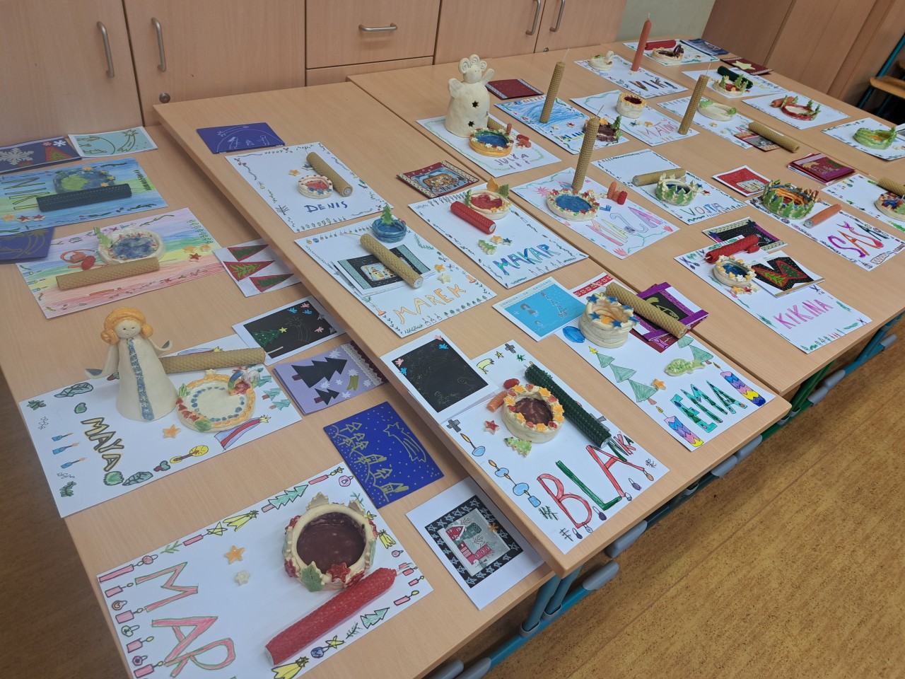 V prosinci vrcholí přípravy na vánoční koncert, besídku, vánoční trhy. Vyrábíme krásná přání, keramiku, motáme svíčky z plátů včelího vosku. Vyrábíme hvězdy z papíru i drátků. Posloucháme koledy, sledujeme videa o narození Ježíška, vyprávíme si o tajných přáních a nadílce pod stromeček. Navštívili jsme Adventní úkolovou stezku a dozvěděli se něco nového o starých vánočních zvycích. Zasportovali jsme si v tělocvičně. Čteme knihu na pokračování Brunclík a lev.
