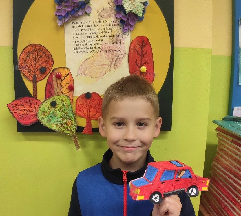 Vytvořili jsme 3D autíčka - vybarvili a vystřihli, nezapomněli jsme dokreslit do okének svého kamaráda.