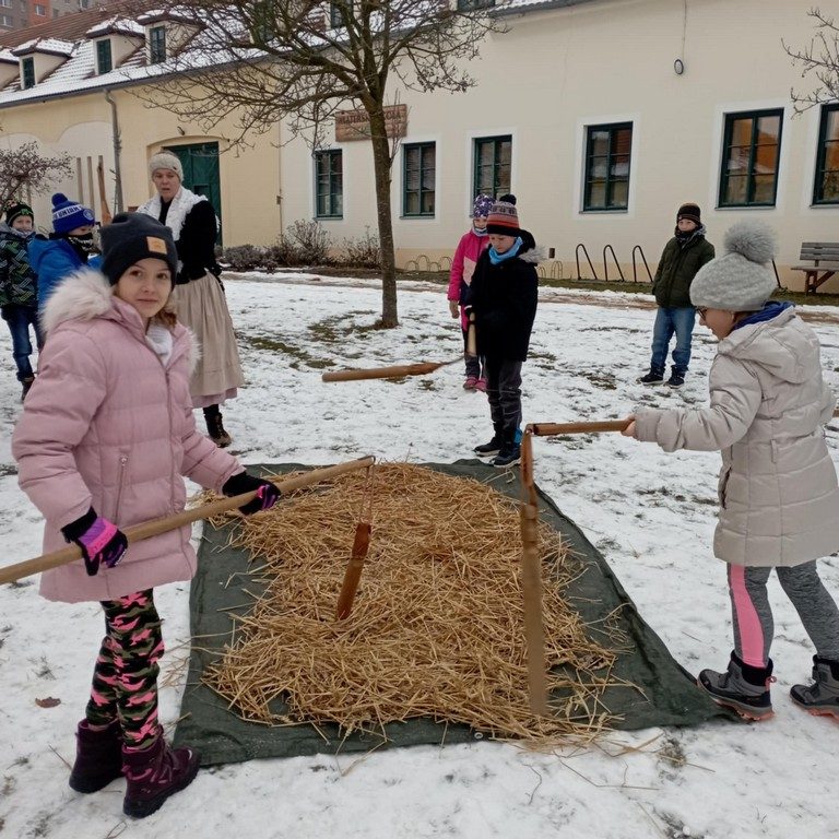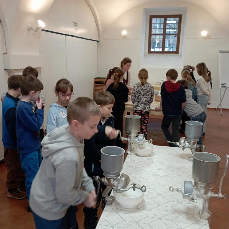 03.02.2026Žáci 3.A měli možnost poznat nejen teoreticky, ale také prakticky, jaký proces předchází k upečení chleba. Naučný pořad v Toulcově dvoře byl zaměřený na dávné doby, kdy nebyla téměř žádná mechanizace. Cesta ke chlebu začala uspořádáním obrázků od výsevu po sklizeň obilí, pak si každý mohl vyzkoušet mlácení pšenice cepem, zrno umlít na mlýnku a také vlastníma rukama zamíchat těsto s kváskem, který připravila lektorka programu. Z těsta vytvořili chlebový bochánek a před pečením ochutili mákem nebo kmínem a solí. Upečený bochánek si všichni odnesli domů a s rodiči si na vlastním výrobku pochutnali. V celém dopoledním programu žáci získávali spoustu nových informací a dovedností a také představu o hospodaření se surovinami, které jsou pro život důležité.